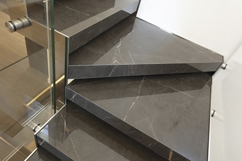 Dignas de mención, las escaleras con escalones ensamblados con corte a 45°, colocados con Pietra Grey lustrado, donde el color nítido ha sido combinado con el pasamanos de vidrio transparente, y la cocina con isla realizada a medida en Calacatta Light siempre con acabado lustrado: una especie de inestimable tesoro engarzado en un espacio esencial.