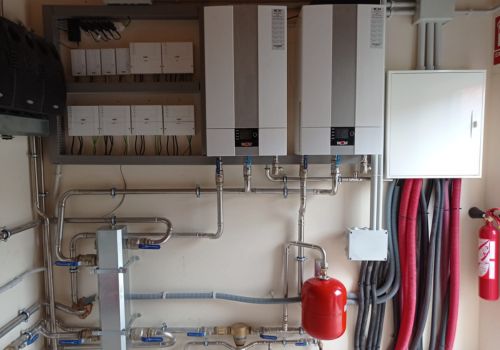 Para equipar este edificio, la propiedad ha confiado en WOLF, uno de los proveedores líderes de sistemas de calefacción, climatización y ventilación en Europa, que ha suministrado dos bombas de calor, CHA-Monoblock de 10kW de potencia cada una, para cubrir toda la demanda de calefacción y ACS utilizando un sistema en cascada gestionado mediante KM-2 y cinco circuitos de calefacción independientes con regulación climática, gestionados por sus correspondientes MM-2.