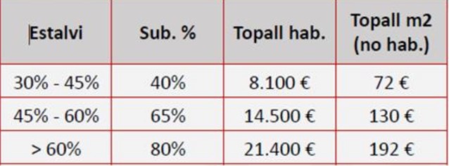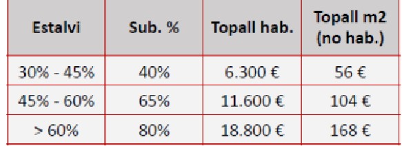 En el caso de las subvenciones por edificios, la subvención puede ir del 40% al 80% en función del ahorro conseguido -del 30% a más del 60%- tal y como indica el cuadro: