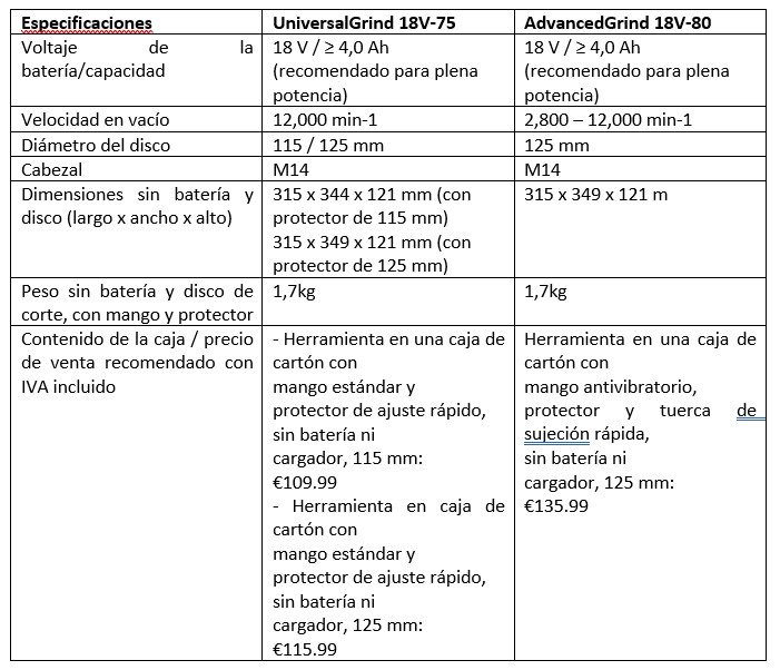 AdvancedGrind 18V-80 ya está disponible para su compra. UniversalGrind 18V-75 estará disponible a partir de enero de 2023. Los accesorios ya están disponibles en la gama de accesorios de Bosch. Todos los precios indicados se indican en PVPR (IVA incluido).