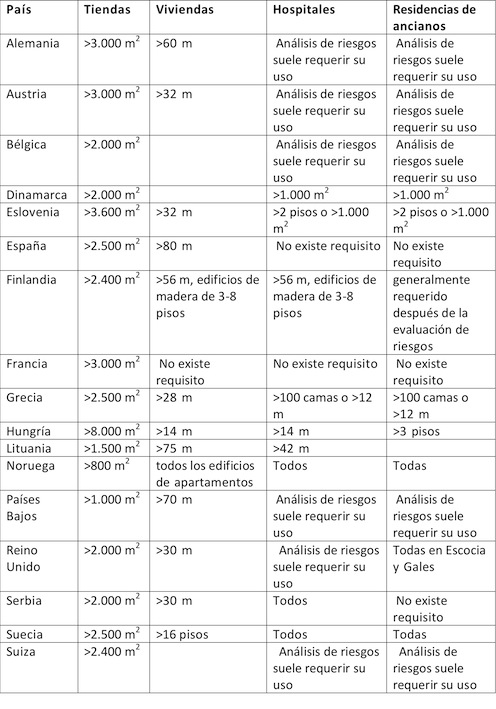 En la mayoría de los países de nuestro entorno se presenta una tendencia reglamentaria para que las nuevas edificaciones que se construyen están provistas de sistemas automáticos de extinción de incendios; especialmente a partir de una cierta altura de evacuación. En el gráfico de abajo se pueden ver y comparar estos datos: