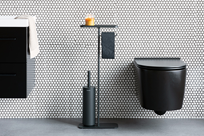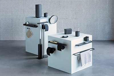 Para el aseo, dispone de una selección de artículos de metal con un revestimiento mineral texturizado, desde una escobilla hasta un mayordomo y desde un portarrollos hasta un dispensador de rollos de papel higiénico con un práctico elevador. Diseñada para que te tomes tu tiempo con estilo.