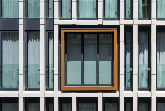 Para los huecos practicables se han empleado ventanas de hoja oculta la serie WICLINE EVO 75 de Wicona, de forjado a forjado –unos 2,70 m de altura- , alargando así la verticalidad de la fachada. Las prestaciones de este sistema, gracias a su módulo de 75 mm, han permitido dotar del máximo confort, tanto térmico como acústico, a cada una de las 97 habitaciones.