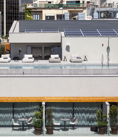 Obra del arquitecto Daniel Isern, el nuevo hotel Olha Eixample se erige en pleno corazón del Eixample de Barcelona, en lo que antiguamente era un edificio de oficinas de los años 70. La reforma ha resultado ser un trabajo de máxima precisión y el resultado, espectacular. Uno de los principales problemas que se debían abordar era el del ruido. Con un subsuelo por donde circula el metro y el ferrocarril, se hacía necesario idear el sistema óptimo para garantizar el confort de los clientes del hotel. Para ello, el arquitecto Daniel Isern ha empleado una tecnología pionera en España que permite acabar con las vibraciones y los ruidos. La intervención ha consistido en diseccionar los pilares existentes, colocar muelles amortiguadores sísmicos y elevar el edificio con gatos hidráulicos de manera que el hotel queda suspendido, y donde las vibraciones no tienen cabida.