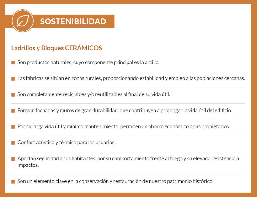 Las seis familias de productos cerámicos –ladrillos cara vista, adoquines, bovedillas, tableros, tejas y ladrillos y bloques para revestir- son fabricados a partir de materiales de origen natural, como es la arcilla, permitiendo además gracias a su reciclaje un compromiso de economía circular pudiendo incluso ser utilizados para la propia fabricación de nuevos productos cerámicos, en un ciclo cerrado de reciclaje.