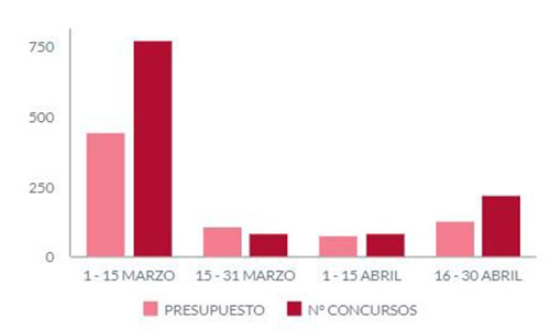 A partir de la entrada en vigor del Estado de alarma, se puede apreciar el descenso en la obra pública, tanto en el número de concursos como en el presupuesto. No obstante, en la segunda quincena de abril podemos apreciar una ligera recuperación.