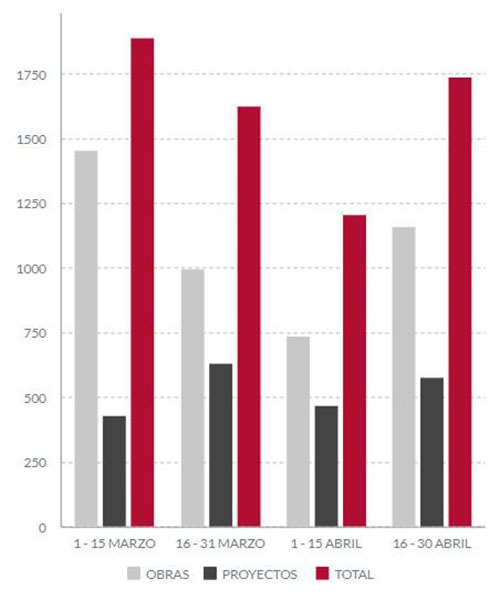 En total, los presupuestos para obras y proyectos en abril notan una caída respecto a los presupuestos en marzo, pasando de 3.079M€ a 2.750M€, siendo el momento de parón casi total de actividad (primera quincena de abril) el momento que más cae la financiación.
