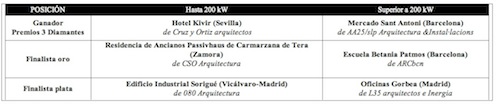 Los grandes protagonistas de esta edición se han distinguido en dos categorías: Proyectos hasta 200 kW y Proyectos superiores a 200 kW, con lo que este año -como novedad e intentando dar visibilidad a un mayor número de proyectos a destacar por su excelente nivel de eficiencia - contamos con dos Ganadores Premios 3 Diamantes, dos Finalistas Oro y dos Finalistas Plata, y que se repartirán una dotación económica de 35.000 €.