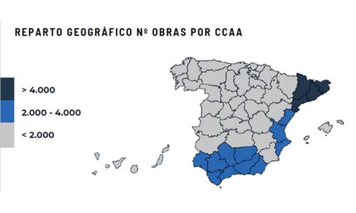 En lo que respecta al reparto geográfico de obras por cada Comunidad Autónoma, destacan especialmente Cataluña y Andalucía alcanzando las 4.060 obras por valor de 3.870 millones de euros y 2.750 obras por 7.330 millones de euros, respectivamente. Cierra el pódium la Comunidad Valenciana, con 2.406 obras valoradas en 2.924 millones de euros.