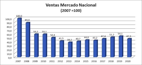 La caída sufrida en 2020 nos lleva a niveles de finales de 2017 y volvemos a estar por debajo de la mitad de la cifra de ventas obtenida en 2007.