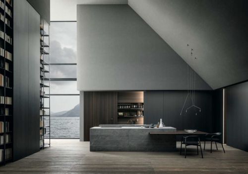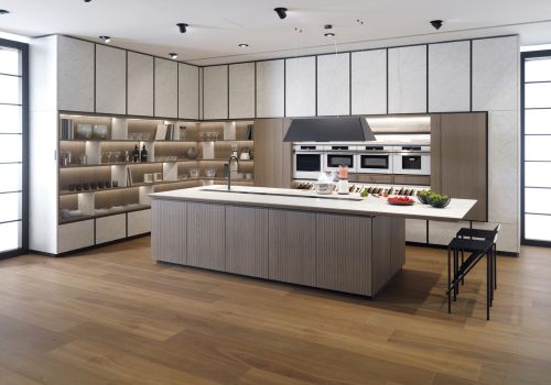 La cocina Blade Lab se caracteriza por su fluidez ergonómica y la innovación en materiales, como la piedra ligera utilizada en la isla central. Se emplea granito Amarula, transformado en un elemento ligero con un espesor de 2 cm. Las hojas Blade de metal Black Dust en la librería Unlimited incorporan tecnología aeroespacial, y el sistema de iluminación LED se integra de forma elegante. Esta cocina encarna la excelencia de Modulnova en diseño y materiales avanzados.