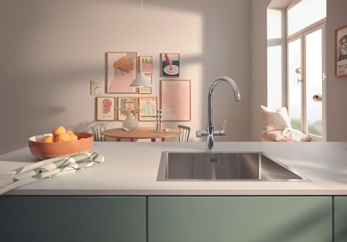 Agrega un gran sabor a tu cocina con los sistemas de agua filtrada GROHE Blue Pure. Convierte el agua del grifo en agua filtrada de gran sabor, reduciendo el cloro y otras impurezas. Además, reemplazar las botellas de plástico por agua del grifo filtrada, nos permite ayudar a combatir el problema mundial de los desechos plásticos.