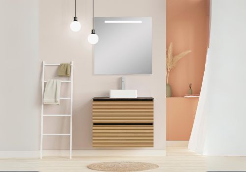 Heisen es una de las colecciones pertenecientes a la familia de baño de la marca. Se trata de un mueble compacto disponible en tres formatos 60, 80 y 100 cm, que se caracteriza por su frontal en madera alistonada y sus costados en negro. El interior está disponible en acabado textil y cuenta con organizador en el cajón superior. Completa el conjunto con las encimeras de silestone en Negro Marquina y Calacatta. Este mueble aporta elegancia y sofisticación en la estancia de cualquier hogar.