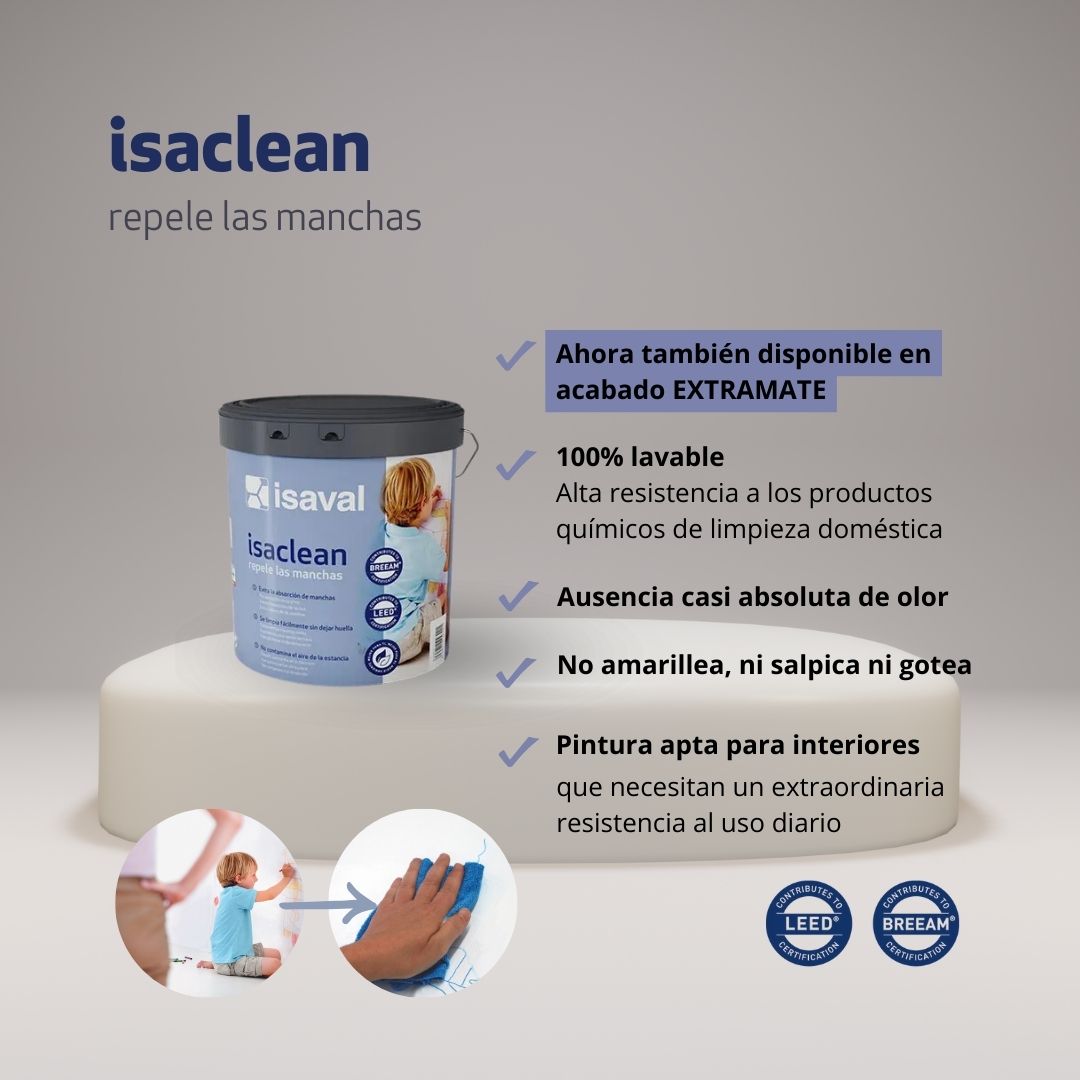 Con el lanzamiento de su acabado extra mate, Isaclean reafirma el liderazgo de Isaval en el mercado, proporcionando una solución avanzada y adaptada a las necesidades de sus clientes. Con todo ello, este producto consolida su posicionamiento como una de las mejores soluciones para el decorado de paramentos interiores propensos a sufrir manchas domésticas.