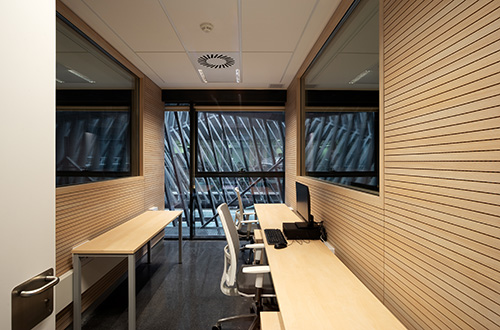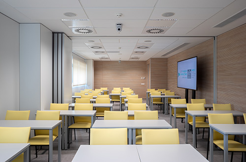 Para las aulas, se han elegido materiales con muy buenas prestaciones acústicas. El acabado de los paneles acústicos se realiza tipo roble unificando con la puerta de acceso a las aulas, diseñada ex profeso por Enero, con un visor estrecho para permitir visualizar el aula desde el exterior pero con el espacio suficiente para que no distraiga a los alumnos que están dentro del aula. Además, una de las salas cuenta con un panel móvil acústico para las futuras necesidades educativas y poder subdividir el aula en dos. A nivel de aplicaciones tecnológicas en el aula, la escuela cuenta con un sistema de Audiovisuales de última generación, con todas las aulas interconectadas mediante pantallas de gran formato (85”), micrófonos y cámaras en techo. Y con una pantalla de orador a modo de pizarra, que puede proyectarse sobre la pantalla principal. Una aplicación pensada para la formación en la era COVID, que permite impartir las clases en las tres aulas de forma simultánea.