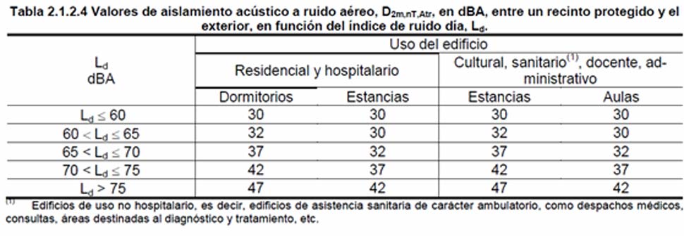 Los valores de la tabla 2.1 del DB HR son el resultado de la diferencia de los niveles de inmisión exteriores y los objetivos de calidad acústica interior para distintos tipos de edificios: Residencial, hospitalario, docente, administrativo y cultural.