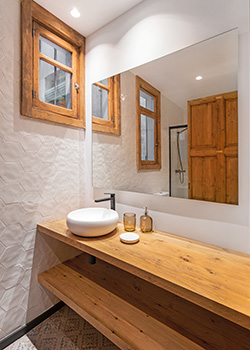 En el baño, la madera natural comparte el protagonismo con el blanco del revestimiento cerámico hexagonal de las paredes y del lavamanos ovalado. Dos tablas horizontales de madera hacen la función de encimera y almacenaje. Contrasta el negro mate de la grifería empotrada y la mampara de la ducha.