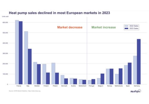 Las ventas de bombas de calor en 14 países europeos cayeron en conjunto alrededor de un 5% en 2023 respecto a 2022, pasando de 2,77 millones a 2,64 millones.
