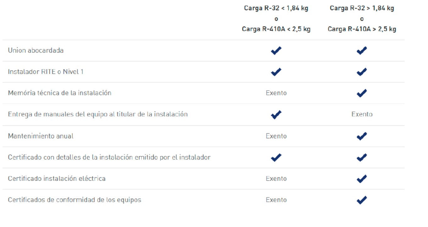Así, pues, igual que con el R-410A, los instaladores RITE y frigoristas nivel 1 ya pueden instalar equipos cargados con R-32 y, además, ya no existen diferencias administrativas entre los equipos cargados con uno u otro gas, sino que las obligaciones administrativas dependen únicamente de las cargas de gas de las mismas, tal como se puede observar en el cuadro resumen de abajo: