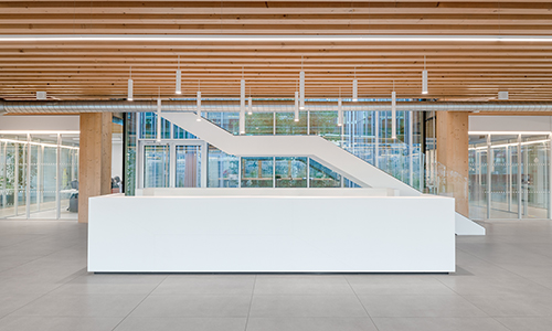 El proyecto se define por la estructura ligera de madera laminada combinada con otros materiales como el vidrio y el acero para garantizar la solidez y la transparencia y ofrecer el máximo confort en el interior. El gran voladizo que cubre el edificio también debía cumplir unos requisitos estéticos y técnicos muy claros: permitir que la luz natural penetre en el interior para proporcionar el máximo confort visual y térmico, reduciendo al mismo tiempo el deslumbramiento al mínimo.