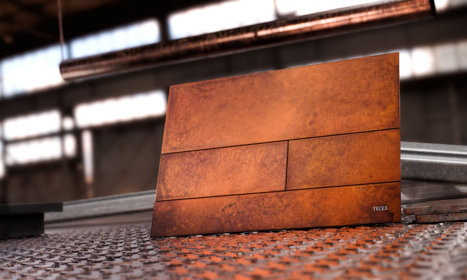 La placa de accionamiento TECEsquare en acero oxidado lleva el estilo vintage industrial chic al baño. La fábrica de lacado de Lehner hace cada una de ellas a mano, con un acabado único y duradero.