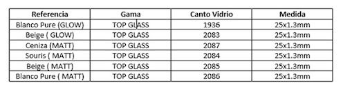 ServiCanto presenta la nueva gama de canto VIDRIO en 25x1.3mm ( PMMA/ Acrílico) para la colección TOPGLASS . Calidad superior de nueva tecnología en acabado mate y brillo.