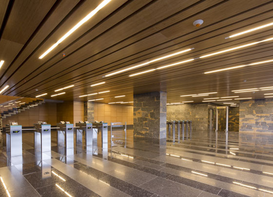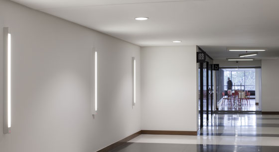 En los pasillos y en el lobby se han colocado unas luminarias FIL de Lamp Lighting -algunas de superficie y otras empotradas- con difusor de policarbonato de 28w individuales o de 2400mm con equipo DALI. También se han instalado luminarias FIL en la pérgola exterior de la entrada al edificio. Por otra parte, Lamp Lighting también ha participado en el proyecto con sus proyectores SHOT LED, que iluminan la escultura “Morichal” ubicada en el exterior de la entrada del edificio.