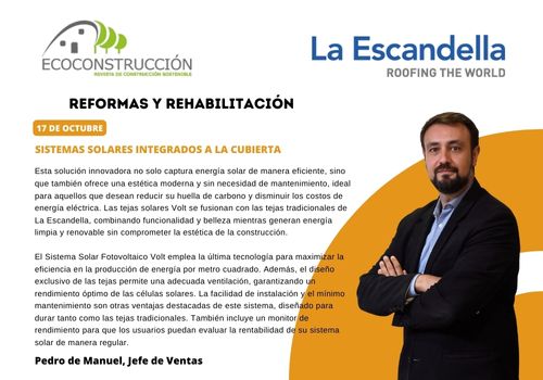 Pedro de Manuel, Jefe de Ventas de Cerámica La Escandella, presentará el Sistema Solar Fotovoltaico Volt, una innovadora solución que se integra completamente en la cubierta de los edificios. Esta tecnología eficiente y de bajo mantenimiento no solo genera energía solar, sino que también aporta una estética moderna, ideal para quienes buscan sostenibilidad y reducción de costos de energía eléctrica.