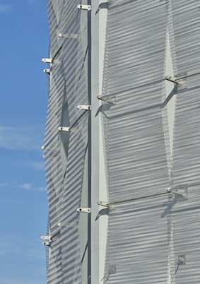 En total se colocaron 16 piezas separadas de hasta 16 metros de longitud con el sistema de fijación TF-30. La malla se extiende a modo de zigzag sobre la mole de hormigón. A esta envolvente ligera se le añadió un sistema de iluminación arquitectónica exterior que proyecta un juego lumínico de colores durante la noche.