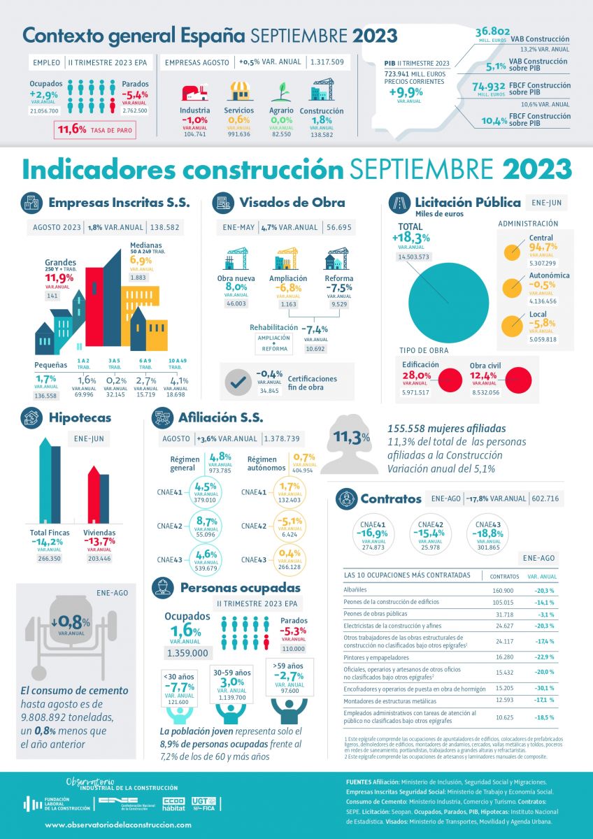 El Observatorio Industrial de la Construcción ha revelado recientemente una infografía que presenta un análisis integral del estado actual del sector de la construcción en España hasta septiembre de 2023.