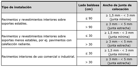 La anchura y dimensionamiento de la junta de colocación se debe elegir en función del tipo y formato de la baldosa, sus tolerancias dimensionales, coeficientes de dilatación térmica de los materiales, grado de estabilidad de los soportes, las condiciones ambientales y las exigencias de uso y, finalmente, según las propiedades de los materiales de rejuntado y sellados seleccionados.
