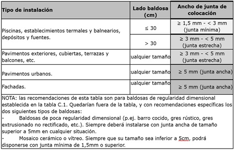 En todos los casos, la separación entre baldosas contiguas siempre será al menos igual o mayor de 1,5 mm de anchura. Se considera junta mínima aquella que oscila entre 1,5 y 3 mm de anchura, junta estrecha aquella que oscila entre 3 y 5 mm de anchura y junta ancha si tiene más de 5 mm de anchura.