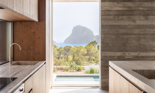 La isla rocosa de Es Vedrà, situada enfrente, actúa como eje perpendicular a la planta de la vivienda. De esta forma todas las estancias tienen el legendario islote ibicenco centrado en sus vistas.