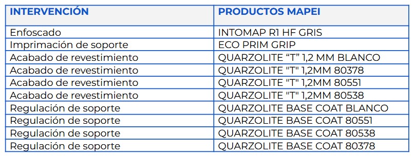 El edificio se proyectó con diferentes zonas de color de pintado, diferenciando zonas como forjados vistos en balcones, partes de cerramientos de balcones y zonas laterales del edificio en acabado acrílico, en cuatro colores distintos Mapei. Para las zonas donde se realizasen con acabado acrílico, se imprimaron previamente todas las superficies mediante la base reguladora acrílica pigmentada, que uniforma, rellena y promueve la adherencia QUARZOLITE BASE COAT, en cuatro colores: Blanco - 80378-80551-80538. Finalmente, se realizó el acabado con el revestimiento acrílico, de elevada protección y propiedades de rellenado QUARZOLITE TONACHINO (en 1,2 mm de granulometría) en cuatro colores diferentes: Blanco - 80378-80551-80538