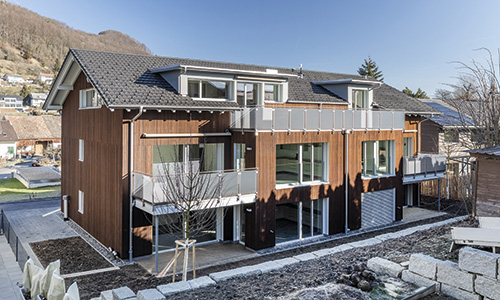 El ensayo se realizó en una vivienda multifamiliar con estructura de madera, obra de az Holz AG, situada en la localidad suiza de Büren. Zehnder Group ya había participado en la fase de planificación del proyecto de construcción en 2017. Esto permitió integrar fácilmente la amplia tecnología de medición para registrar los datos del ambiente interior en el edificio durante la fase de construcción 2018/19. La casa multifamiliar de Büren se construyó de forma modular y consta de un total de cinco viviendas. De las cinco, cuatro han sido equipadas con una tecnología de sensores integral. Dos de las viviendas, con superficies de 80 m² y 110 m², se ventilan manualmente a través de las ventanas; las otras dos viviendas con las mismas superficies están equipadas con un sistema de ventilación equilibrada Zehnder ComfoAir Q350. Junto con la bomba de calor con sonda geotérmica Zehnder ComfoHeat de 25 kW y el acumulador de agua caliente de Zehnder, las unidades de ventilación se instalaron en la sala de máquinas del sótano. El calor en las viviendas se emite a través de suelo radiante. En verano, el suelo radiante también puede proporcionar refrigeración mediante el sistema Free Cooling.