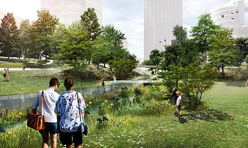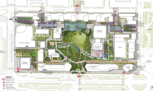 Este proyecto convertirá la zona de AZCA en un espacio más conectado, abierto y accesible bajo el paraguas de la sostenibilidad, creando un ecosistema urbano de gran biodiversidad formado por especies vegetales autóctonas, recuperando antiguos cauces fluviales que mezclan sistemas de captación y almacenaje de agua de la lluvia para riego y fuentes.