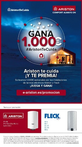 Ariston te cuida y te premia, sorteando 1.000€ semanales por tus instalaciones de termos eléctricos Ariston y Fleck.